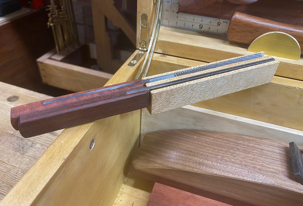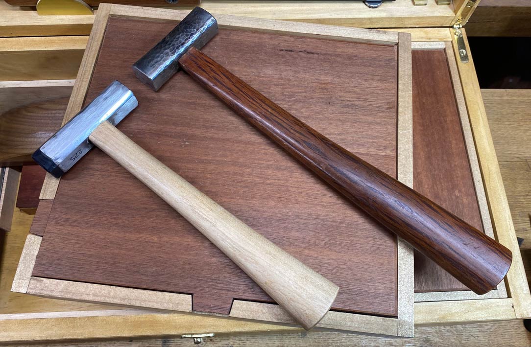 The gennou has a modified 225 gm head - one side has a UHMW cap for setting plane bodies and working with bench chisels, while the steel end is used to set blades. The handle is shaped from Hard Maple, and shorter than a standard gennou to fit the tool box. I like its balance. At 225 gm it is a good compromise for wacking chisels and setting blades ...