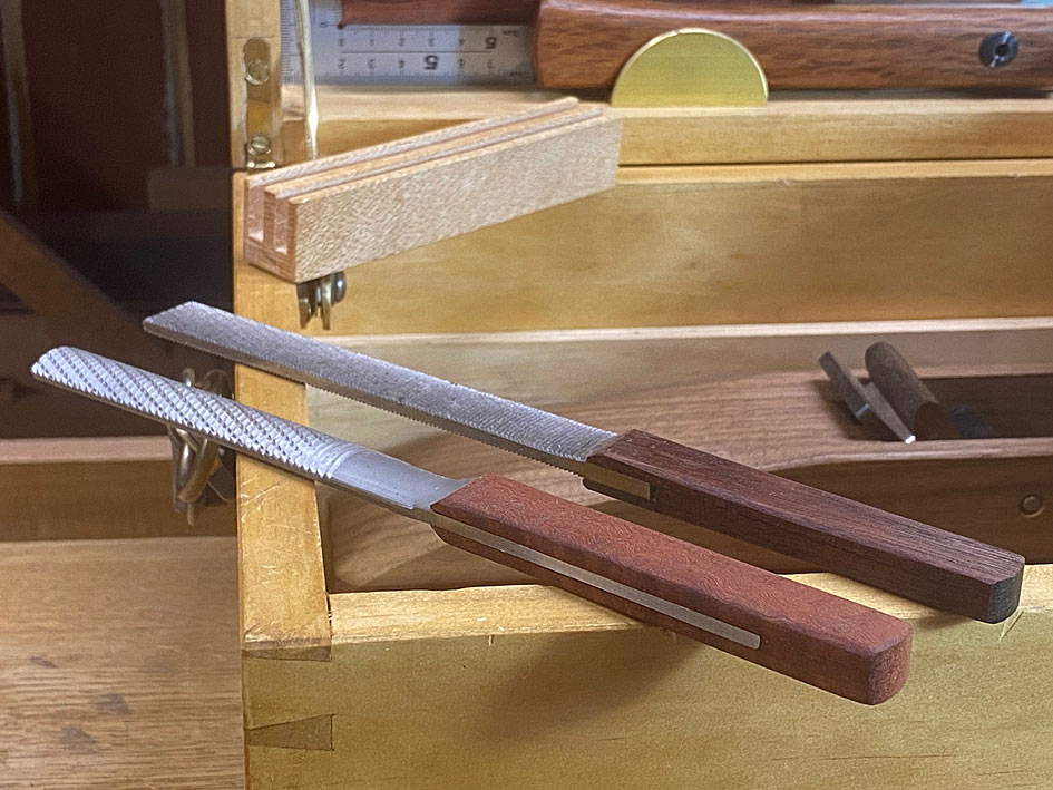 I have included two Japanese wood files, one flat with medium cut teeth, and the other rounded. These files have safe side edges, which is a plus. On the negative side, they require a light touch to avoid stalling. This needs practice and they are not kind to a heavy hand.