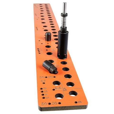 I have the CMT Boring template, a versatile template for 32mm on center holes. It is setup for use either for 8mm dowels or for drilling shelf holes on 32mm centers. It will also drill holes for Blum hinges. I got mine with a dedicated oversized self centering drill guide and bit, but it will work equally well with a 14mm guide bushing and a plunge router.